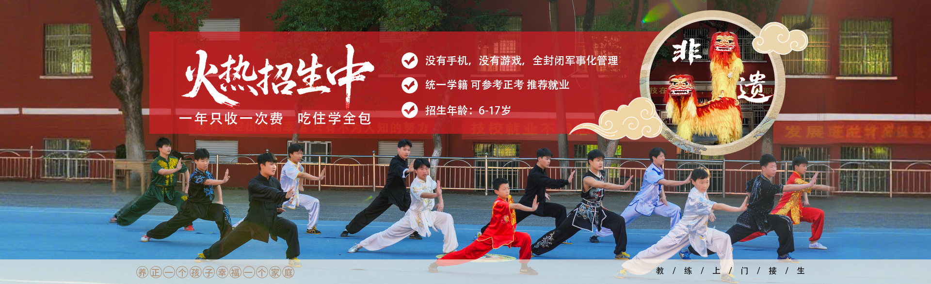 文武双修,因材施教,学习文化课,培养学生武术特长增强自信、自立、自强。